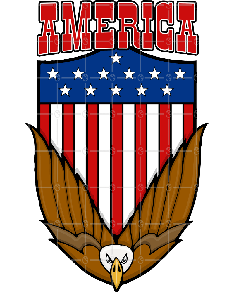 bald eagle swooping down with US shield in the background