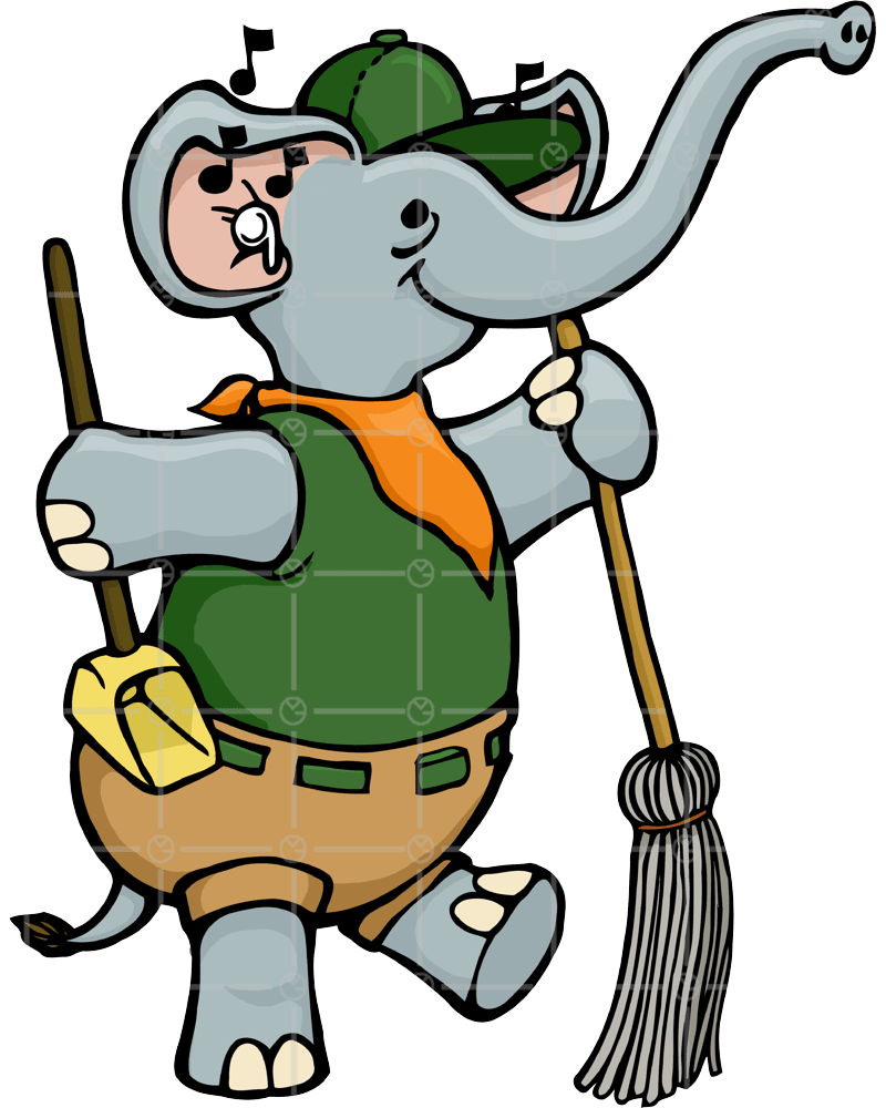 cartoon elephant zookeeper sweeping the zoo