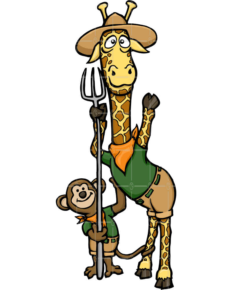 cartoon giraffe and monkey zookeeper holding a pitch fork and waving
